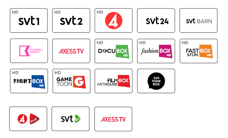 SVT1, SVT2, SVT24, SVT Barn/Kunskapskanalen, TV4, Axess TV, DocuBox, FashionBox, Fast&FunBox, FightBox, GameToon, FilmBox Arthouse och 36o TuneBox. Samt Play-biblioteken SVT, TV4 Play samt Axess Play.